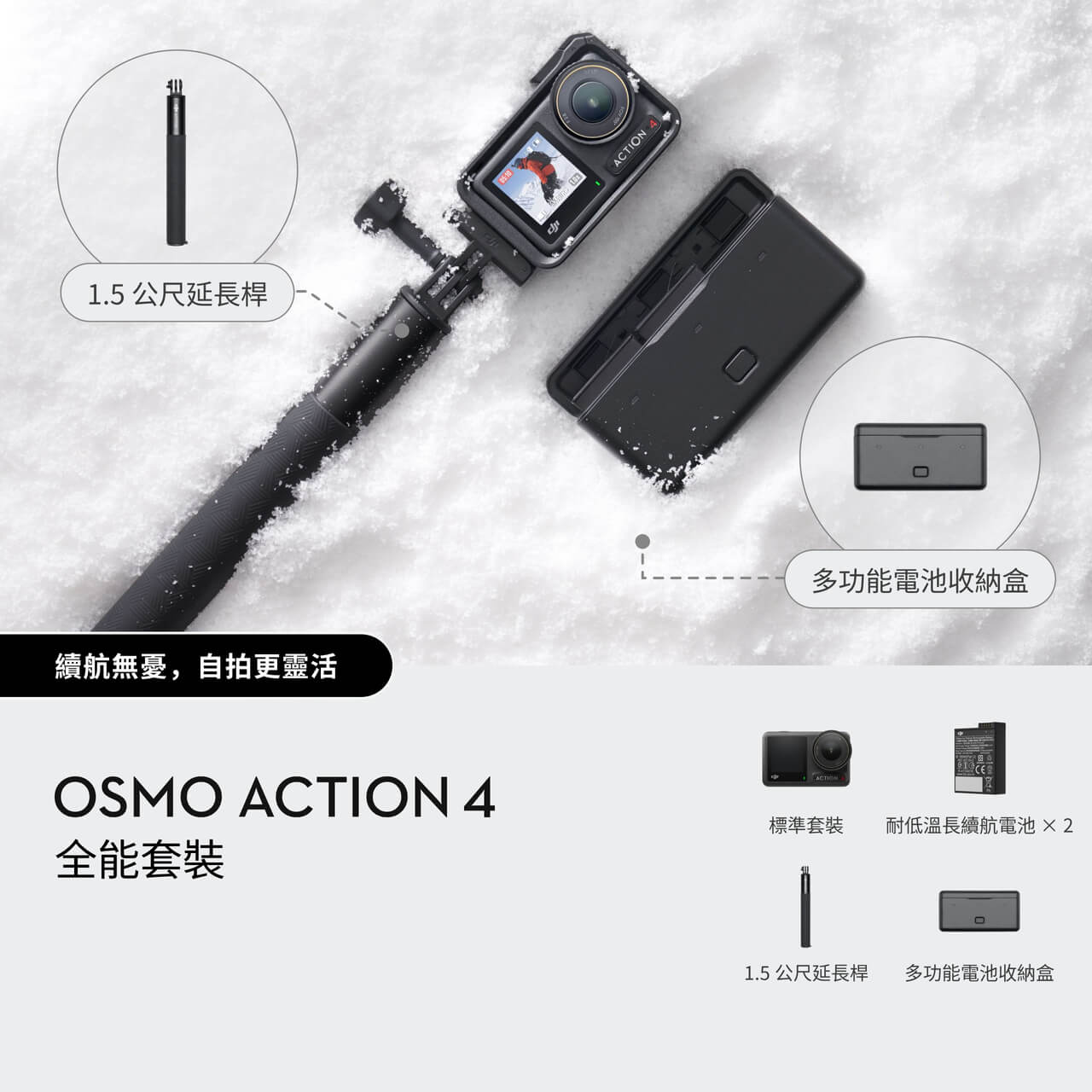 1/1.3 英吋 CMOS & 低光影像 10-bit & D-Log M 色彩表現 耐低溫 & 長續航 4K/120fps & 155º 超大視角 磁吸快拆 & 無損直拍 360º 地平線增穩 HorizonSteady 18 公尺裸機防水 前後雙觸控式彩色螢幕