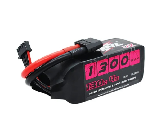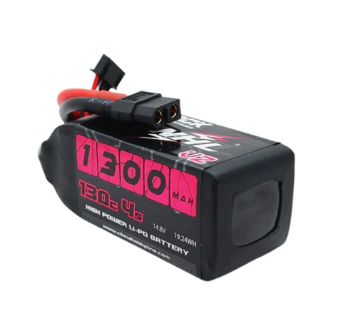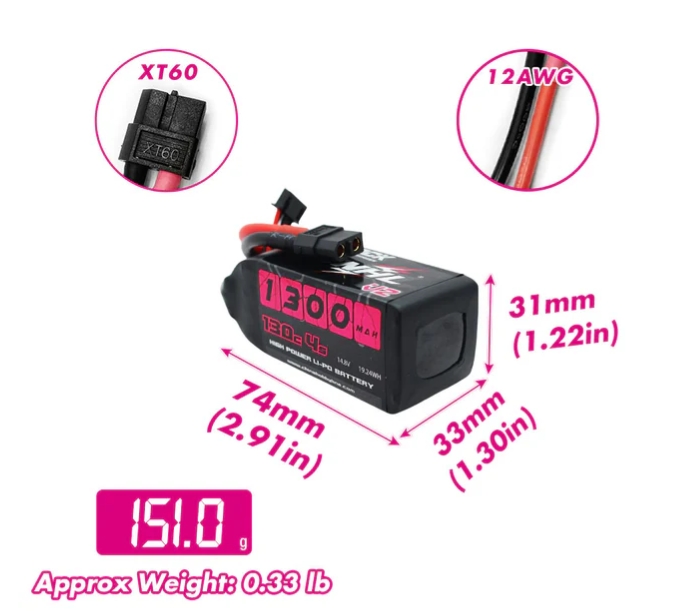 規格: 容量:1300mAh 電壓:14.8V / 4片 / 4S1P 放電率:130C 連續 / 260C 突發 充電率:最大 5C 尺寸:31X33X74mm 重量:約151克 輸出連接器:XT60 線徑(AWG):12#