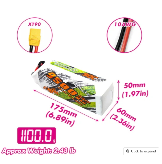 規格: 容量:9500mAh 電壓:22.2V / 6片 / 6S1P 放電率:90C 連續 / 180C 突發 充電率:最大 5C 尺寸:60X50X175mm 重量:約1100克 輸出連接器:XT90 線徑(AWG):10#