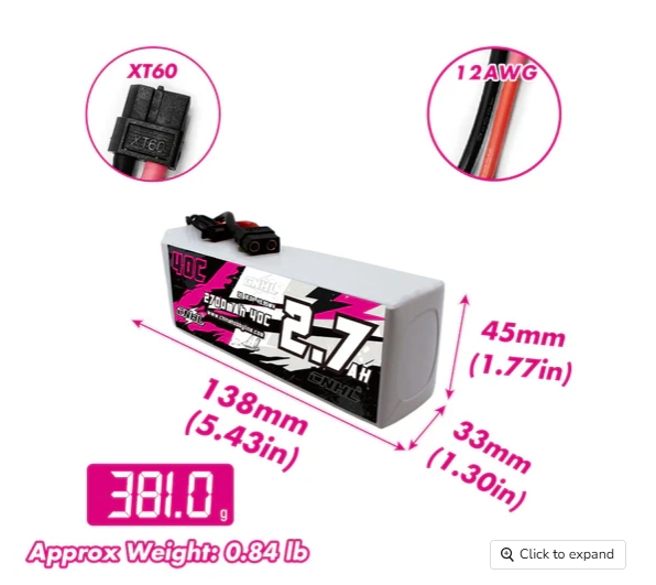 規格: 容量:2700mAh 電壓:18.5V / 5片 / 5S1P 放電率:40C 連續 / 80C 突發 充電率:最大 5C 尺寸:33X45X138mm 重量:約381克 輸出連接器:XT60 線徑(AWG):12#