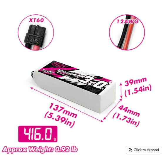 規格: 容量:3300mAh 電壓:18.5V / 5片 / 5S1P 放電率:40C 連續 / 80C 突發 充電率:最大 5C 尺寸:39X44X137mm 重量:約416克 輸出連接器:XT60 線徑(AWG):12#