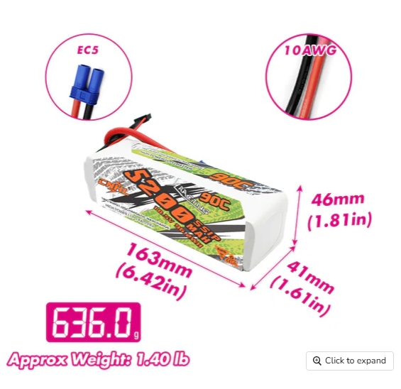 規格: 容量:5200mAh 電壓:18.5V / 5片 / 5S1P 放電率:90C 連續 / 180C 突發 充電率:最大 5C 尺寸:46X41X163mm 重量:約636克 輸出連接器:EC5 線徑(AWG):10#