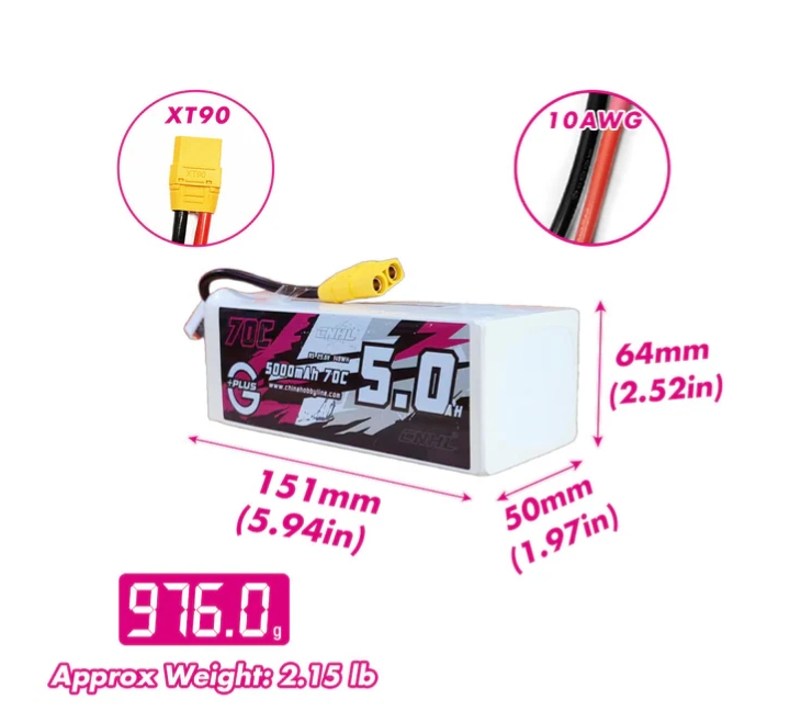 規格: 容量:5000mAh 電壓:29.6V / 8片 / 8S1P 放電率:70C 連續 / 140C 突發 充電率:最大 5C 尺寸:64X50X151mm 重量:約976克 輸出連接器:XT90 線徑(AWG):10#