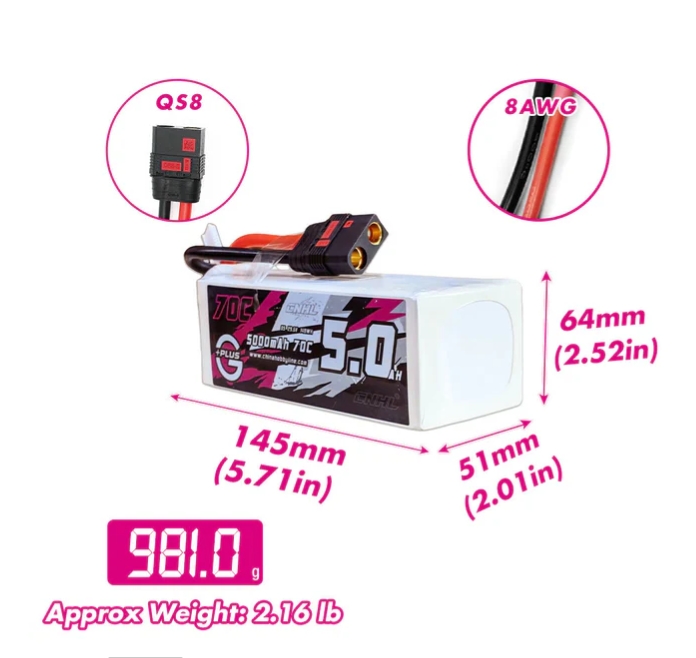 規格: 容量:5000mAh 電壓:29.6V / 8片 / 8S1P 放電率:70C 連續 / 140C 突發 充電率:最大 5C 尺寸:64X50X145mm 重量:約981克 輸出連接器:QS8 線徑(AWG):8#