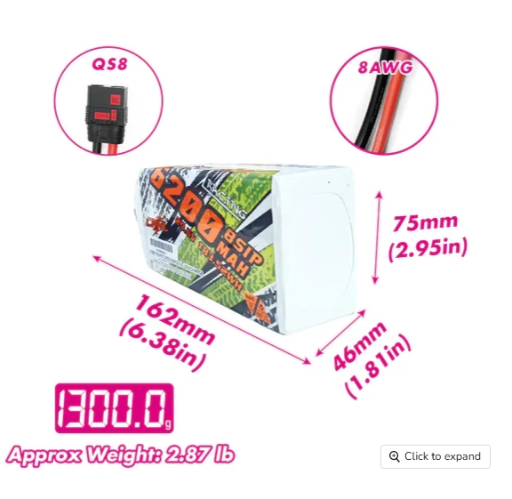 規格: 容量:6200mAh 電壓:29.6V / 8片 / 8S1P 放電率:90C 連續 / 180C 突發 充電率:最大 5C 尺寸:75X46X162mm 重量:約1300克 輸出連接器:QS8 線徑(AWG):8#