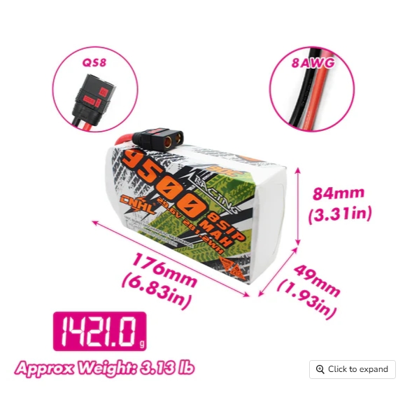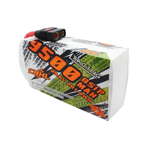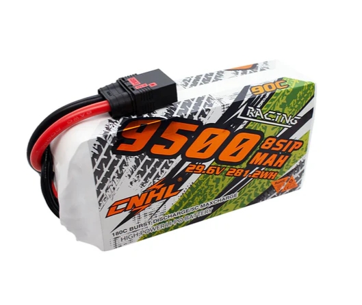 規格: 容量:9500mAh 電壓:29.6V / 8片 / 8S1P 放電率:90C 連續 / 180C 突發 充電率:最大 5C 尺寸:84X49X176mm 重量:約1421克 輸出連接器:QS8 線徑(AWG):8#