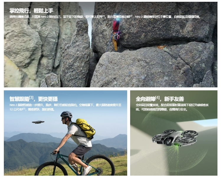 智能跟拍(如人、車追蹤)、多角度追蹤模式、手勢控制(如用手勢請求起飛/變換距離/追蹤對象)也被提及。