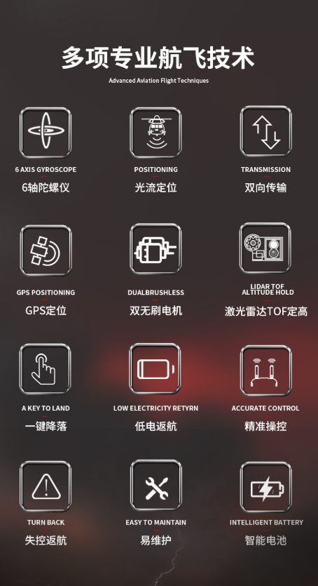 8> 智慧型飛控,搭載GPS模組 指南針模組 下視覺模組 氣壓定高模組,有GPS增穩 下視覺飛行 手動自穩模式 多功能飛行模式,具有一鍵返航 低電智能返航 失控返航 一鍵降落 電子圍欄 一鍵8字航線飛行 一鍵圓週飛行等安全飛行功能。