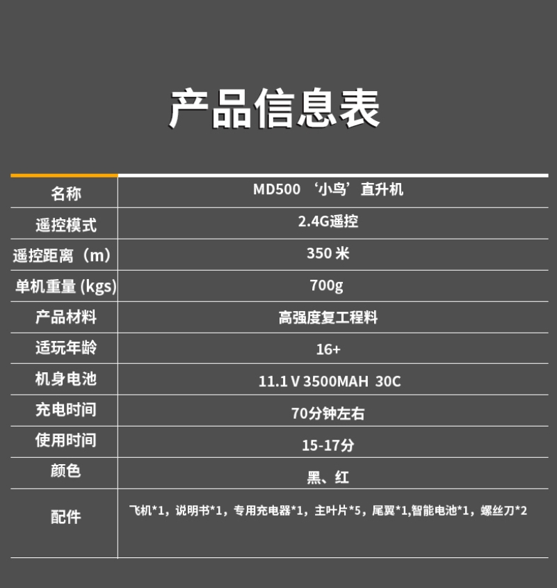 1>根據美國MD500 小鳥直升機16:1比例縮小,具有高模擬外觀細節 酷炫燈光。