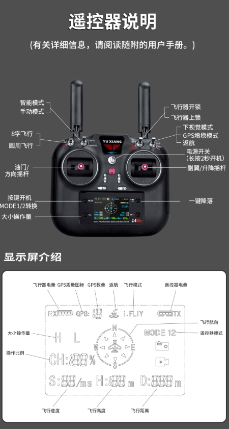 9>全新8通道高精度遙控器,2.4GHZ雙向通訊協定。具備1024級操作手感 高清顯示器 雙向回傳數據,能即時回饋飛行器電量 飛行速度 飛行高度 飛行距離 飛行方位 GPS數量等重要訊息,有效提升用戶精準控制飛行器