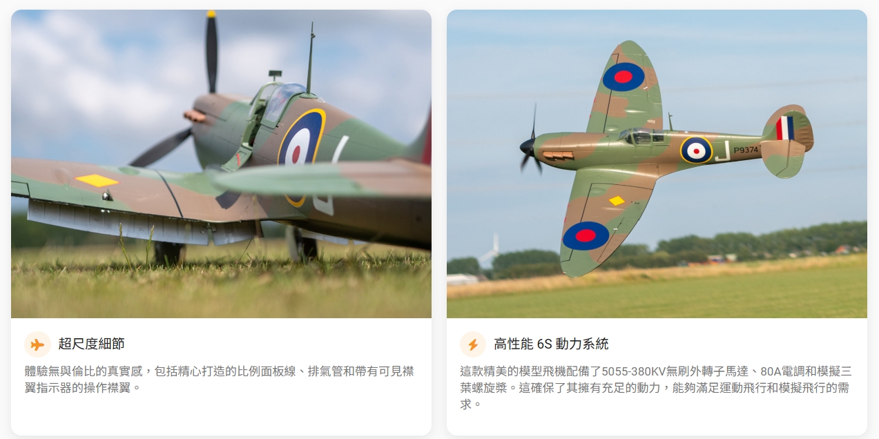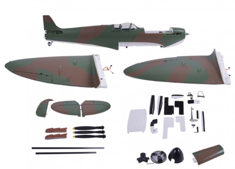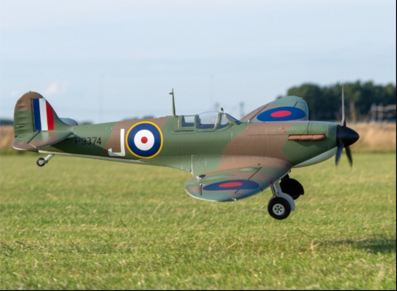 這款噴火戰鬥機遙控飛機配備滑動式座艙蓋和可開啟的座艙門,儀錶板和瞄準器細節豐富。機翼和尾翼上裝有LED導航燈,機翼上方還附有襟翼指示器,完美還原了模擬的分離式襟翼。如果您使用的是Turnigy X-14之類的遙控器,可以選擇「伺服慢速」模式,讓襟翼伺服器以非常逼真的方式緩慢移動。此外,還包含一對模擬可收放起落架,具有模擬艙門和彈簧式避震器;這些都使它成為目前市面上操控性最佳的遙控戰鬥機之一。